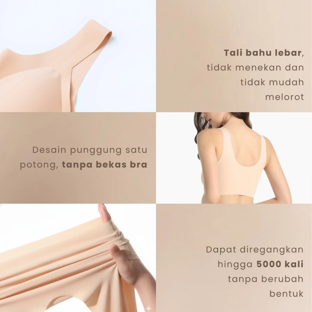 Diproduksi menggunakan teknologi lem titik tanpa mesin jahit, sehingga benar-benar seamless dan tanpa kait di bagian belakang. Memberikan tampilan rapi, tidak terlihat di balik pakaian, dan menyatu seperti kulit kedua.